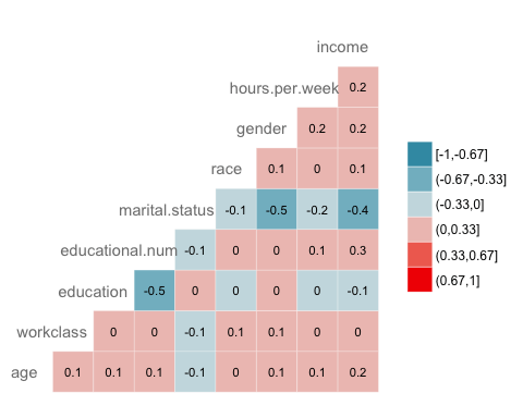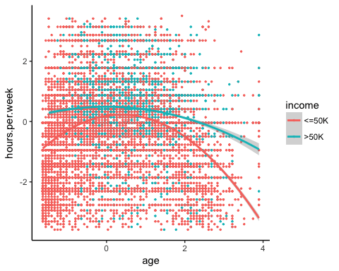 ## X age workclass education educational.num ## 1 -1.732680 -1.02325949 Private 11th -1.22106443 ## 2 -1.732605 -0.03969284 Private HS-grad -0.43998868 ## 3 -1.732530 -0.79628257 Local-gov Assoc-acdm 0.73162494 ## 4 -1.732455 0.41426100 Private Some-college -0.04945081 ## 5 -1.732379 -0.34232873 Private 10th -1.61160231 ## 6 -1.732304 1.85178149 Self-emp-not-inc Prof-school 1.90323857 ## marital.status race gender hours.per.week income ## 1 Never-married Black Male -0.03995944 <=50K ## 2 Married-civ-spouse White Male 0.86863037 <=50K ## 3 Married-civ-spouse White Male -0.03995944 >50K ## 4 Married-civ-spouse Black Male -0.03995944 >50K ## 5 Never-married White Male -0.94854924 <=50K ## 6 Married-civ-spouse White Male -0.76683128 >50K