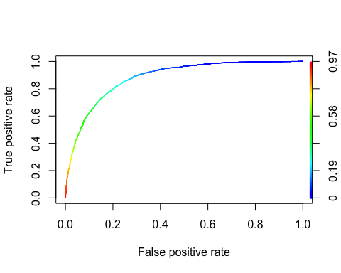 library(ROCR) ROCRpred <- prediction(predict, data_test$income) ROCRperf <- performance(ROCRpred, 'tpr', 'fpr') plot(ROCRperf, colorize = TRUE, text.adj = c(-0.2, 1.7))