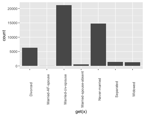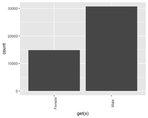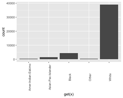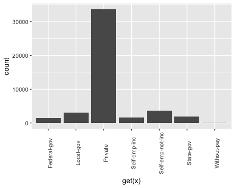 - ggplot(factor, aes(get(x))) + geom_bar()+ theme(axis.text.x = element_text(angle = 90)):为每个 x 元素创建一个条形图。注意,要将 x 作为列返回,您需要将其包含在 get() 中