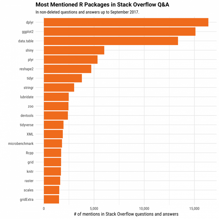 R的主要用途是,并且将始终是,统计、可视化和机器学习。下图显示了Stack Overflow上哪个R包获得了最多的提问。在前10名中,大部分都与数据科学家的工作流程相关:数据准备和沟通结果。