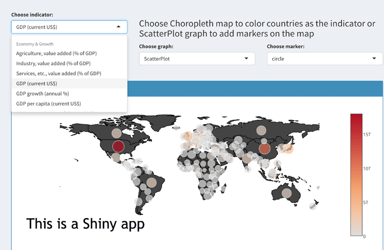 Rstudio有一个很好的工具可以轻松创建应用程序。下面是一个使用世界银行数据的应用程序示例。