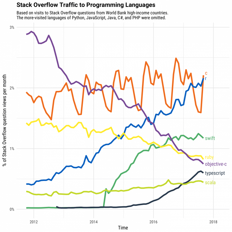 Stack Overflow是编程语言的一个大型社区。如果您遇到编码问题或需要理解模型,Stack Overflow随时为您提供帮助。多年来,R的提问-浏览量百分比相对于其他语言急剧上升。这一趋势当然与数据科学时代的蓬勃发展高度相关,但它反映了R语言在数据科学中的需求。