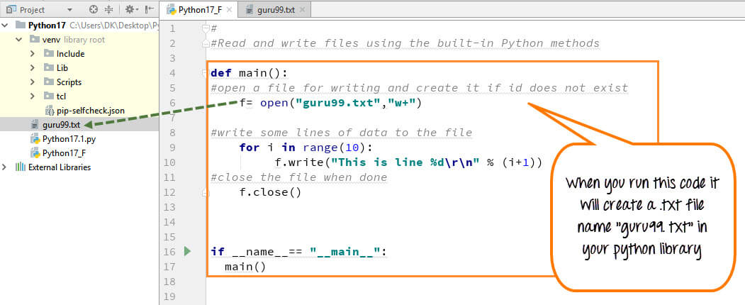 使用Python的写入文件功能,您可以创建.text文件(guru99.txt),方法是我们在此处演示的代码