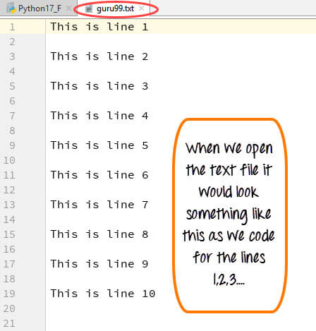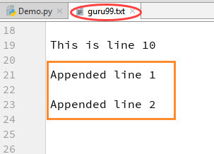 您可以在“guru99.txt”文件中看到输出。代码的输出是,文件已通过Python追加到文件操作追加了新数据。