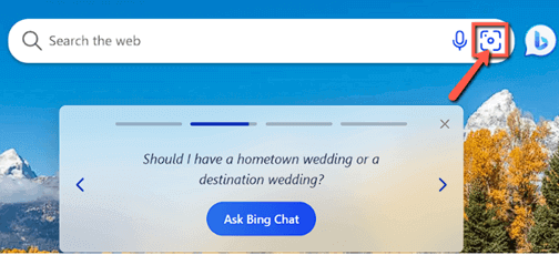 步骤 3)在 Bing 图片中,点击搜索栏中的相机图标,该图标用于“视觉搜索”。