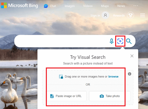 步骤 3) 点击相机图标打开 Bing 的视觉搜索。选择提供的选项之一:“上传图像”、“粘贴图像或 URL”或“拍照”。