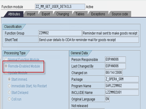 **1) ** 在函数模块属性选项卡(事务代码 SE37)中,将处理类型设置为“远程启用模块”以创建远程函数模块。