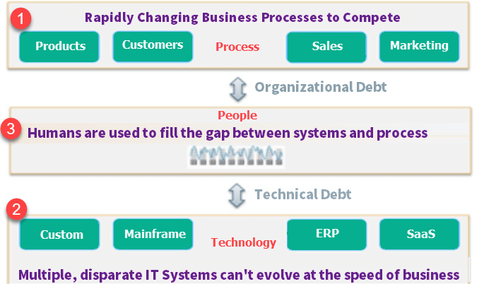 - 一个典型的企业使用多个且互不相连的 IT 系统来运行其业务。随着业务流程的变化,由于预算、时间和实施复杂性问题,这些 IT 系统不会频繁更改。因此,业务流程与 IT 系统中映射的技术流程不匹配。