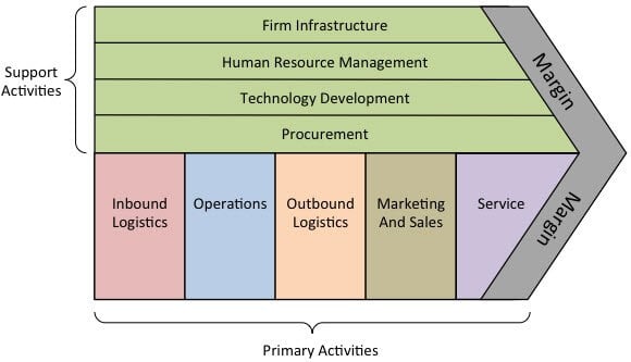 - 支持活动 – 这些活动支持主要活动。支持活动包括采购(购买)、人力资源管理、技术开发和基础设施。