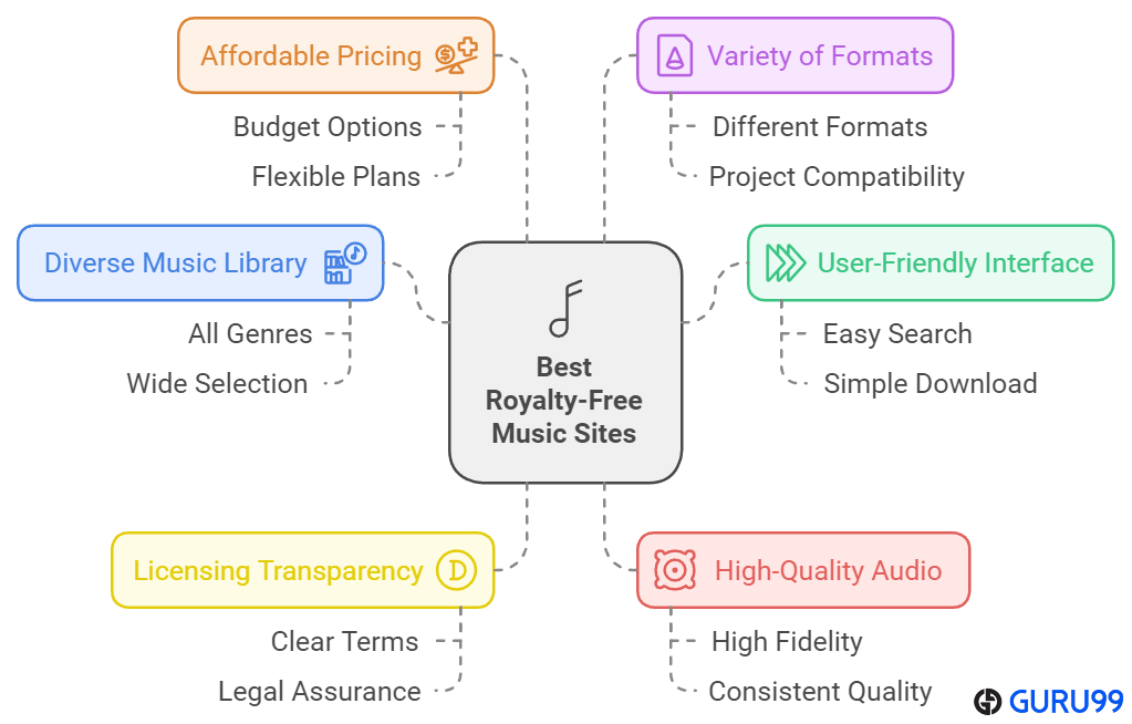 在 **Guru99**,我们致力于可信度,确保我们的内容准确、相关且客观。在研究了 62 多个最佳免版税音乐网站并花了 80 多个小时进行此评测后,我提供了一份值得信赖的指南,涵盖了免费和付费选项。这份深入的分析重点介绍了重要功能,可帮助您找到最终的音乐来源。请查看以下重要因素,这些因素使这些网站成为创作者的绝佳选择,提供了多样化且易于访问的选项。