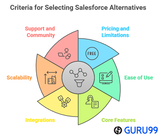 在 Guru99,我们致力于提供值得信赖、相关且准确的信息,以支持明智的决策。我们投入了超过 105 小时评估了超过 30 种 CRM 解决方案——包括免费和付费的——我们创建了本指南,旨在提供对 Salesforce 替代方案的公正见解。我们的专家发现,某些高级平台对于小型团队来说过于复杂,因此我们优先考虑提供基本 CRM 功能、清晰定价和用户友好界面的工具。这些免费 CRM 平台可靠、高效,并且能够满足实际业务需求,特别是对于初创公司或小型企业。我们在审查工具时侧重于以下因素:
