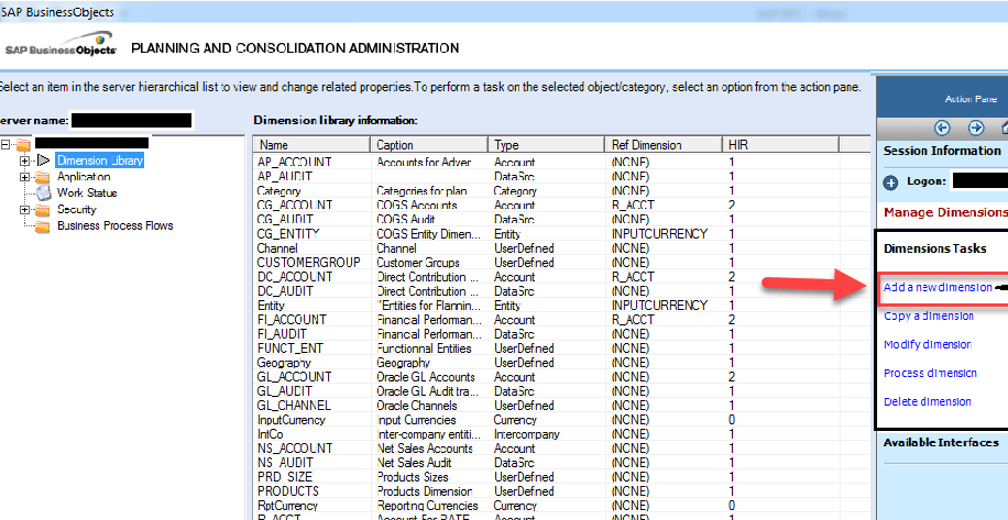 在左侧选择维度库。操作窗格将显示相关的维度任务。