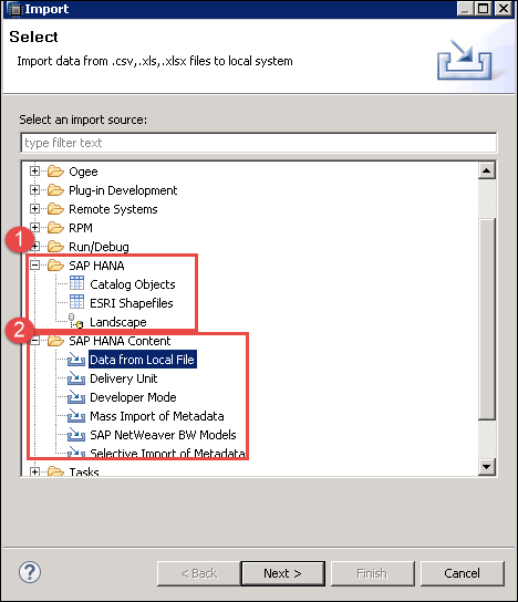 SAP HANA 对象将显示两个导入选项 –