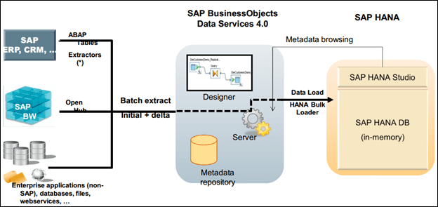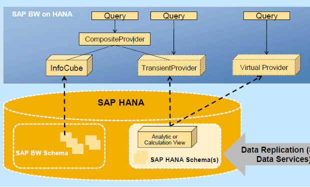 SAP BI 支持许多数据库,但是当我们从源数据迁移到 SAP HANA 时,架构将如下所示: