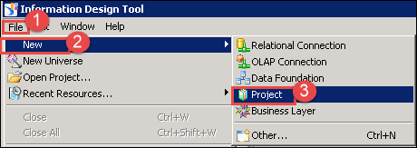 信息设计工具屏幕将出现。要创建 Universe,我们需要在 IDT 中创建一个项目。