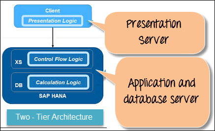 SAP HANA 扩展应用程序服务 (SAP HANA XS) 基于 2 层架构,其中应用程序服务器、Web 服务器和开发环境嵌入在同一系统中。
