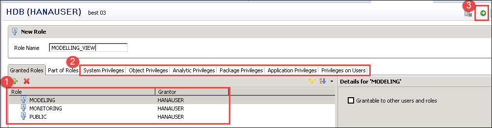 这是授予权限的标准机制。权限可以直接授予用户。SAP HANA 数据库中有许多标准角色(例如 MODELLING、MONITORING 等)。
