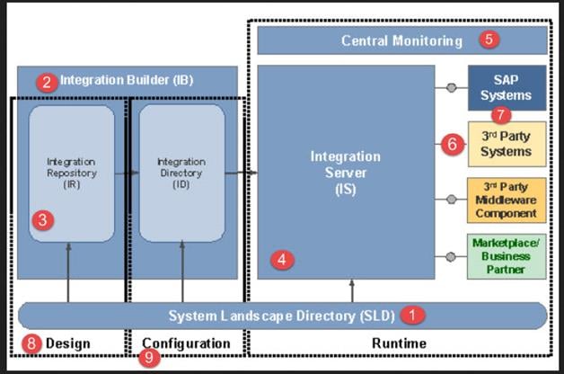 SAP PI 并非单个组件负责 SAP 和非 SAP 应用程序的集成,而是一个组件集群,共同使 SAP PI 发挥作用。SAP PI 的这种架构或组件在设计时、配置时和运行时都会被使用。SAP PI 的各种组件包括