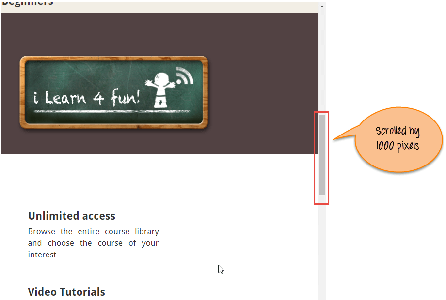 脚本描述:在上述代码中,我们首先在 Chrome 浏览器中启动给定的 URL。接下来,通过 executeScript 将页面滚动 1000 像素。Javascript 方法 ScrollBy() 将网页滚动到特定像素数。