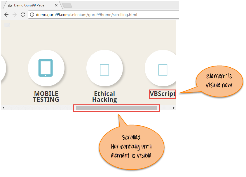 脚本描述:在上述代码中,我们首先在 Chrome 浏览器中启动给定的 URL。接下来,水平滚动页面直到指定元素在当前页面上可见。Javascript 方法 scrollIntoView() 滚动页面直到指定元素完全可见。