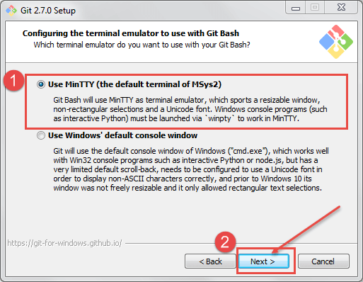 - 选择“使用 MinTTY”是 MSys2 的默认终端,用于 Git Bash