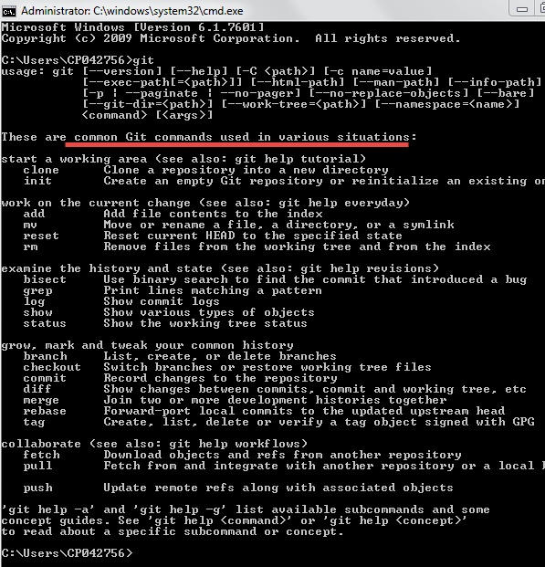 打开命令提示符,键入“git”并按“Enter”键。如果看到以下屏幕,则表示安装成功。