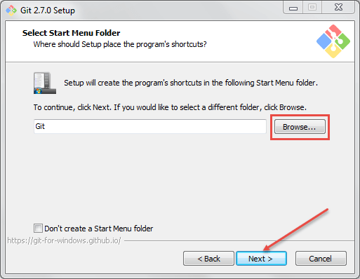 步骤 10) 如果要为 Git 创建开始菜单文件夹,请保留默认设置并点击下一步。