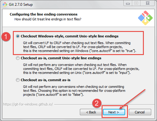 - 选择“检出 Windows 风格,提交 Unix 风格的行尾”。(GitHub 应该如何处理文本文件中的行尾)。