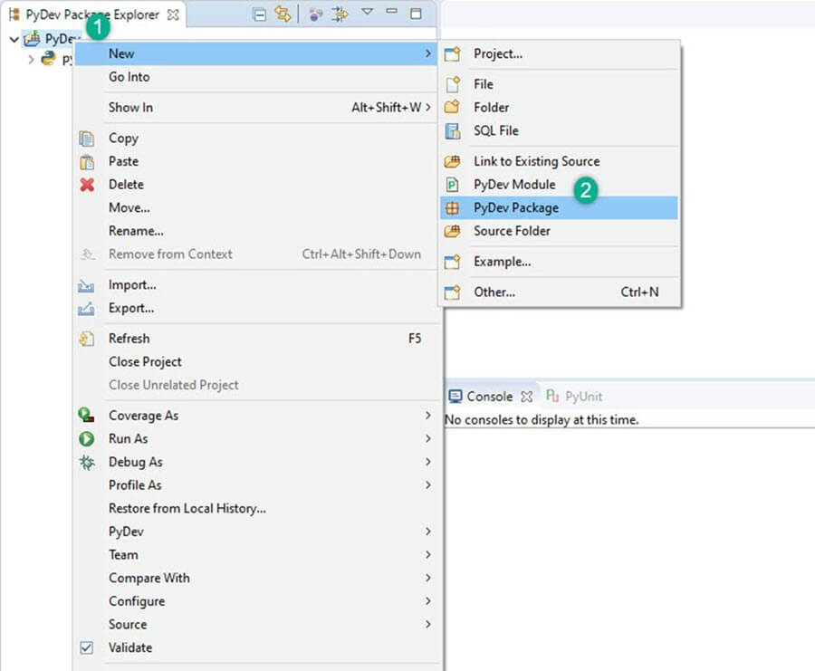 - 右键点击 PyDev 包资源管理器 > 新建。
