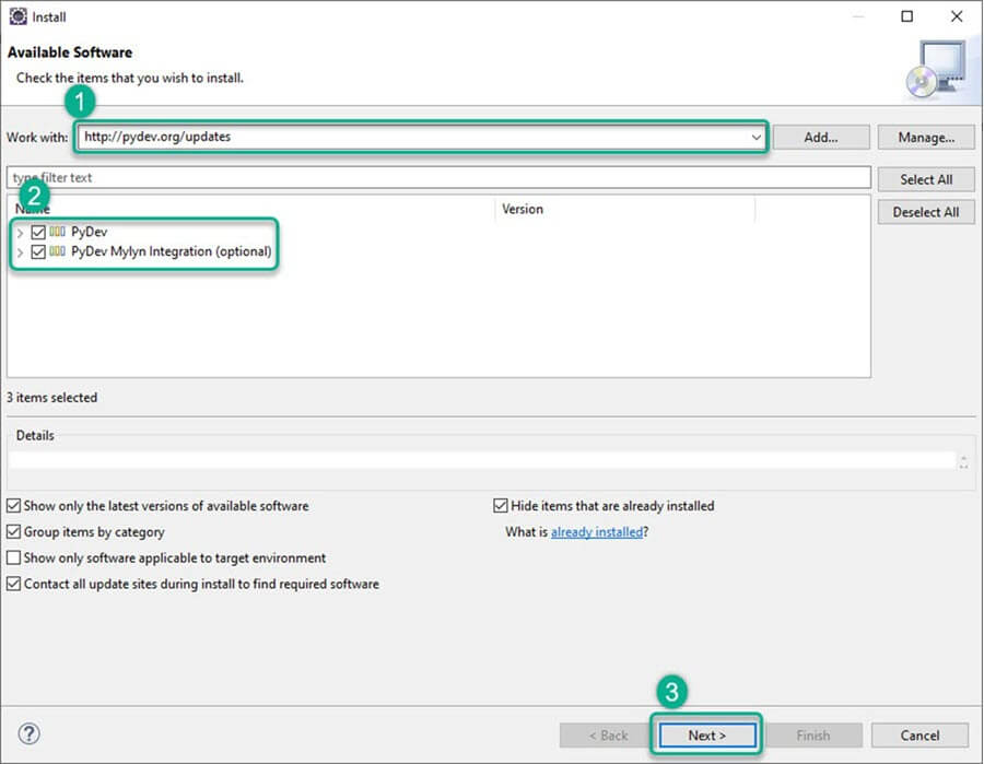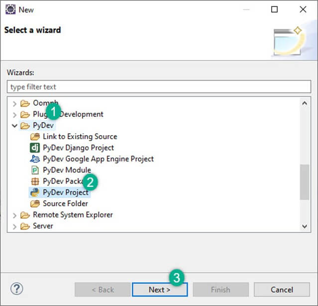 下一步是为 Eclipse 安装“pydev IDE”。