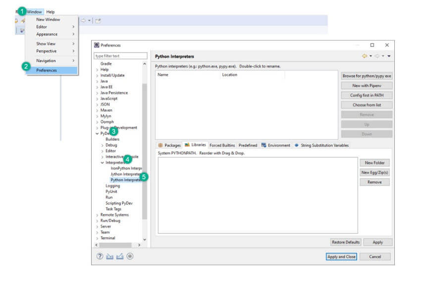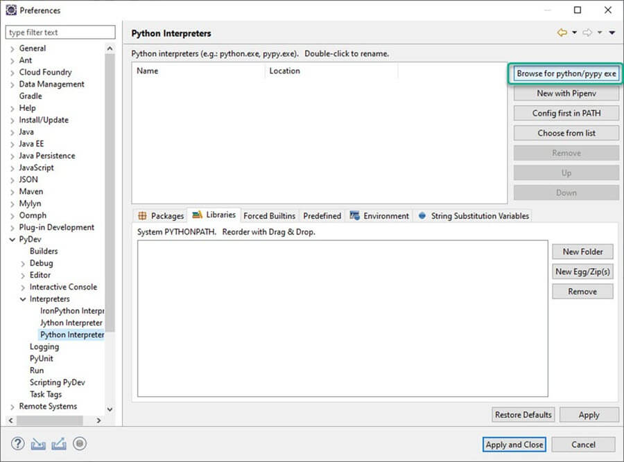 转到窗口 > 首选项 > PyDev > 解释器 > Python 解释器。