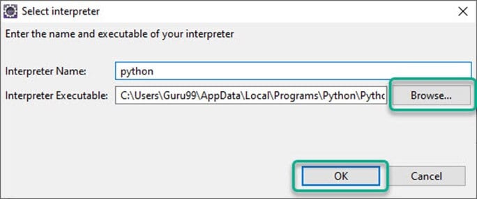步骤 5) 在此步骤中,提供“解释器名称”和 Python 的“exe”文件路径。