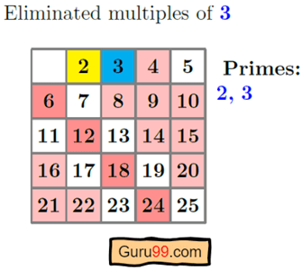 步骤 3) 然后我们选择下一个最小的未标记数字,即 3,并通过标记 3 的倍数重复上一步。