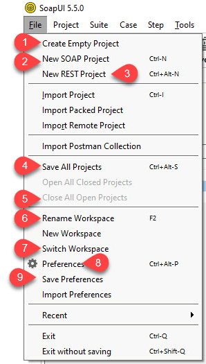 - 了解 SOAP-UI 中最常用的导航对于在实际项目工作中实现无缝导航非常重要。让我们先看看文件菜单。