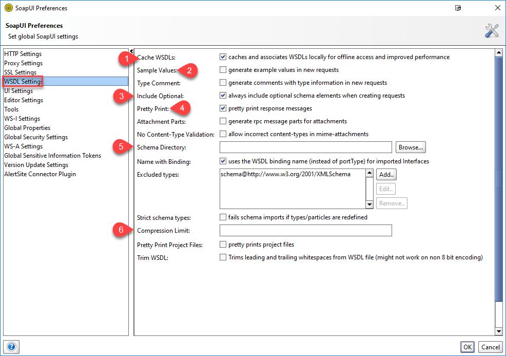 - 允许用户在验证 WSDL 请求时指定包含模式 (.xsd) 文件的目录。更改此目录内容后,SOAP UI 需要重新启动。