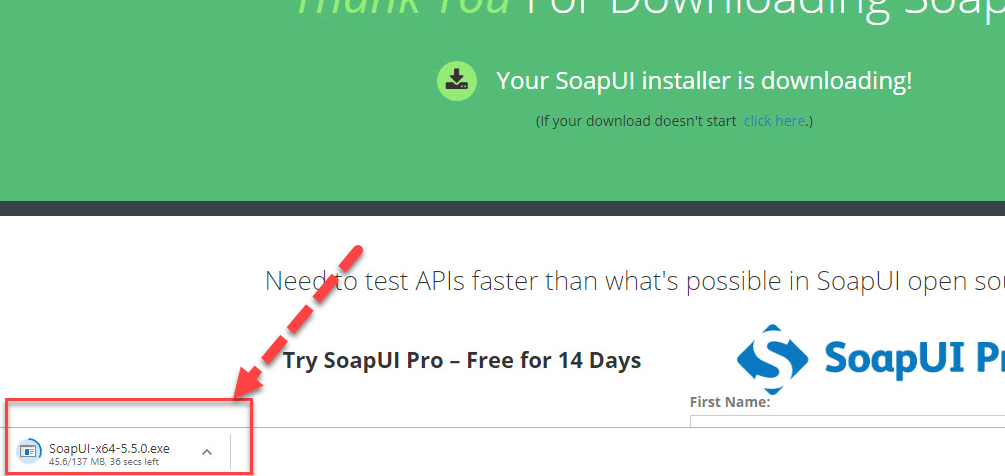 - 点击下载后,用户会自动转发到https://www.soapui.org/downloads/thank-you-for-downloading-soapui/,安装程序下载自动开始。