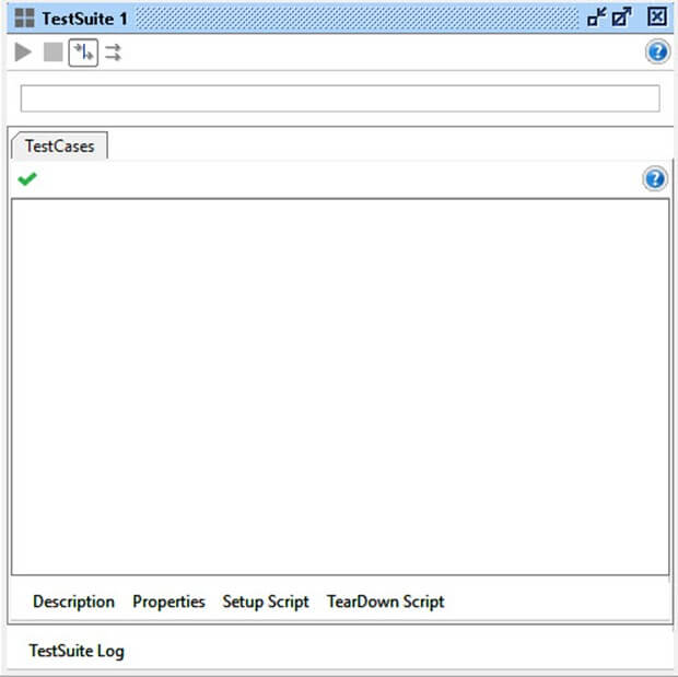 测试套件窗口在右侧窗格中打开。由于我们刚刚创建,所以没有 SoapUI 测试用例。因此所有选项都已禁用。