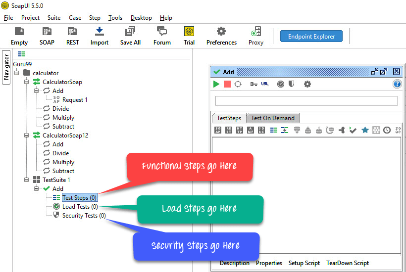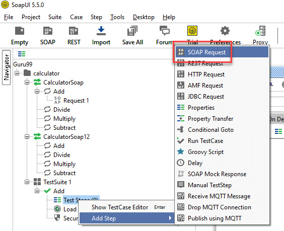 步骤 4) 我们可以通过右键单击测试步骤并选择适当的测试步骤来插入各种测试步骤,如下所示。因此,如果要测试 REST Webservice,您将选择 REST 测试请求。