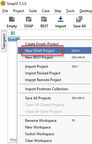 步骤 1) 现在,根据项目,我们需要导入 SOAP/REST 协议。我们将创建一个新的 SOAP 项目。