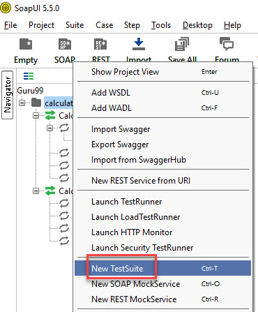 - 为导入的 WSDL 创建测试套件: 在项目中为导入的 WSDL 创建一个 SoapUI 测试套件。