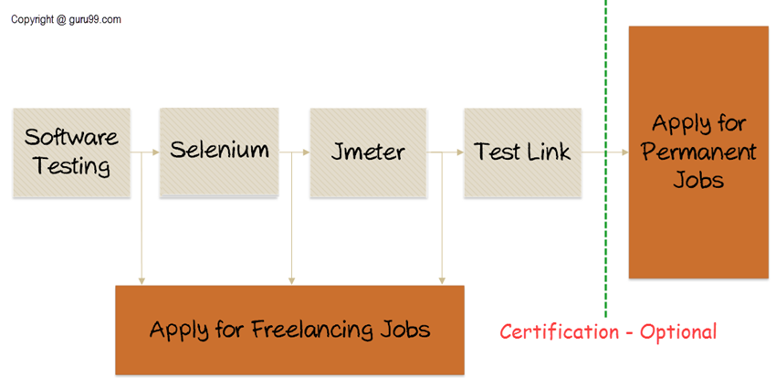 接下来,您将学习 Selenium——自动化工具,然后是 JMeter——性能测试工具,最后是 TestLink——测试管理工具。在您学习的同时,我们建议您申请自由职业(除了其他好处,您还会赚到一些钱!)。