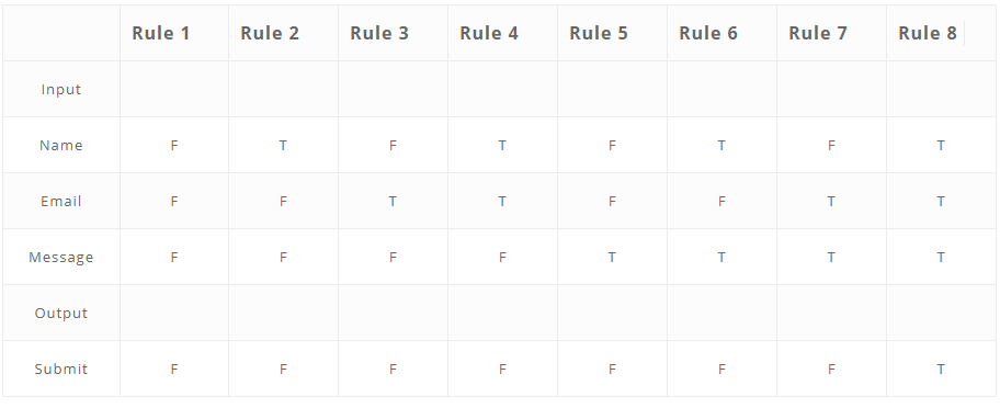 决策表也称为因果表。这种软件测试技术用于响应输入或事件组合的函数。例如,如果用户已输入所有必填字段,则应启用提交按钮。