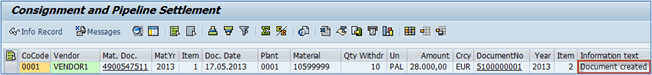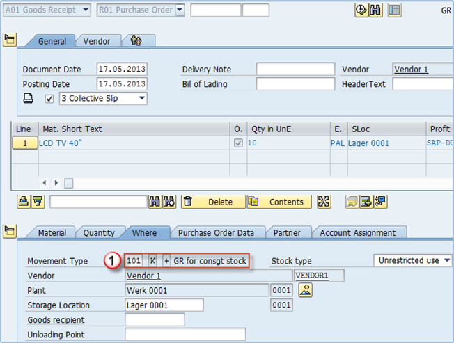 - 您可以看到移动类型是101,特殊库存标识是K – 寄售库存(供应商)。