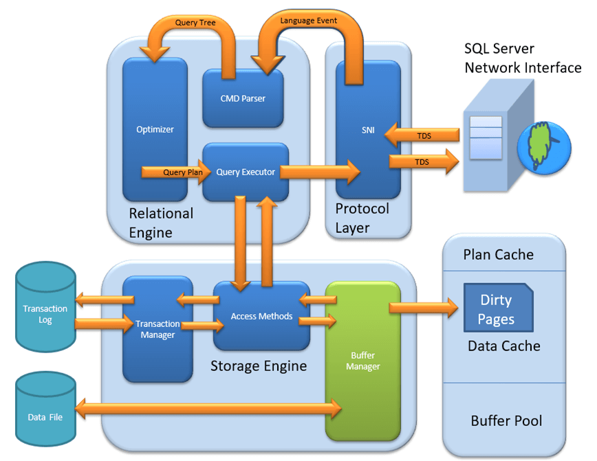 MS SQL Server 是一种客户端-服务器架构。MS SQL Server 进程以客户端应用程序发送请求开始。SQL Server 接受、处理请求并用处理过的数据响应请求。让我们详细讨论下图所示的整个架构