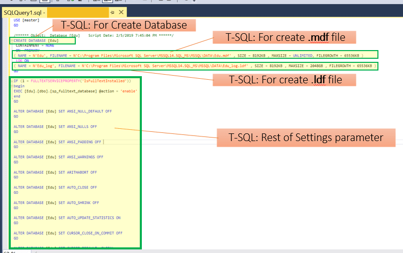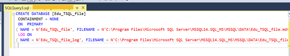 CREATE DATABASE [Edu_TSQL_file] CONTAINMENT = NONE ON PRIMARY ( NAME = N'Edu_TSQL_file', FILENAME = N'C:\Program Files\Microsoft SQL Server\MSSQL14.SQL_MS\MSSQL\DATA\Edu_TSQL_file.mdf' , SIZE = 8192KB , MAXSIZE = UNLIMITED, FILEGROWTH = 65536KB ) LOG ON ( NAME = N'Edu_TSQL_file_log', FILENAME = N'C:\Program Files\Microsoft SQL Server\MSSQL14.SQL_MS\MSSQL\DATA\Edu_TSQL_file_log.ldf' , SIZE = 8192KB , MAXSIZE = 2048GB , FILEGROWTH = 65536KB )