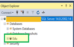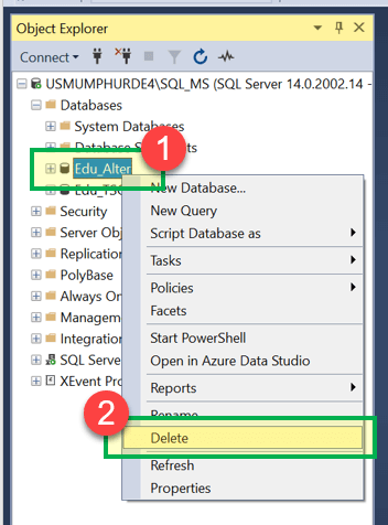 结果:“Edu_Alter”已从“对象资源管理器”数据库列表中删除。