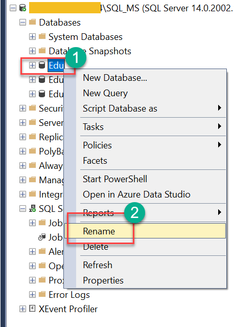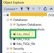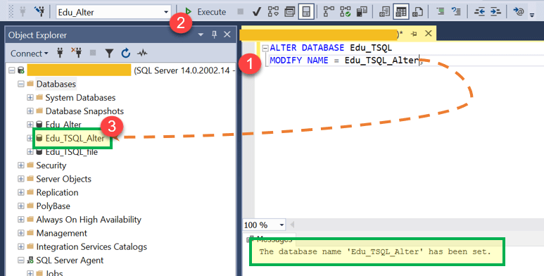 结果:数据库名称已从“Edu_TSQL”重命名为“Edu_TSQL_Alter”。