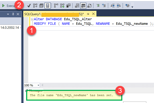 Alter DATABASE Edu_TSQL_Alter; MODIFY FILE ( NAME = Edu_TSQL, NEWNAME = Edu_TSQL_newName );