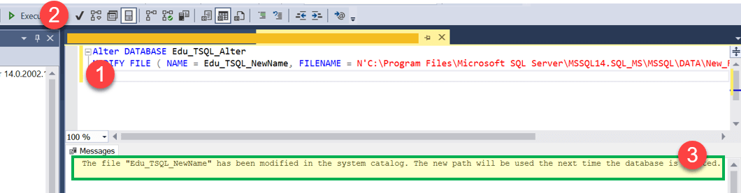 Alter DATABASE Edu_TSQL_Alter; MODIFY FILE ( NAME = Edu_TSQL_NewName, FILENAME = N'C:\Program Files\Microsoft SQL Server\MSSQL14.SQL_MS\MSSQL\DATA\New_File\Edu_TSQL_log.ldf' );