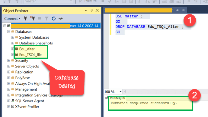 结果:“Edu_TSQL_Alter”已从“对象资源管理器”数据库列表中删除。